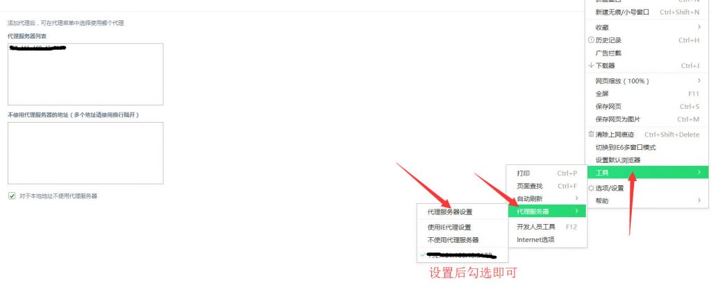 4. 进入 https://www.whatismyip.com/ 测试是否生效. 二、360 浏览器 路径依次为:设置 - 工具 - 代理服务器 - 代理服务器设置,输入IP到 代理服务器列表 即可. 使用的时候,直接点击IP勾选就可以了.