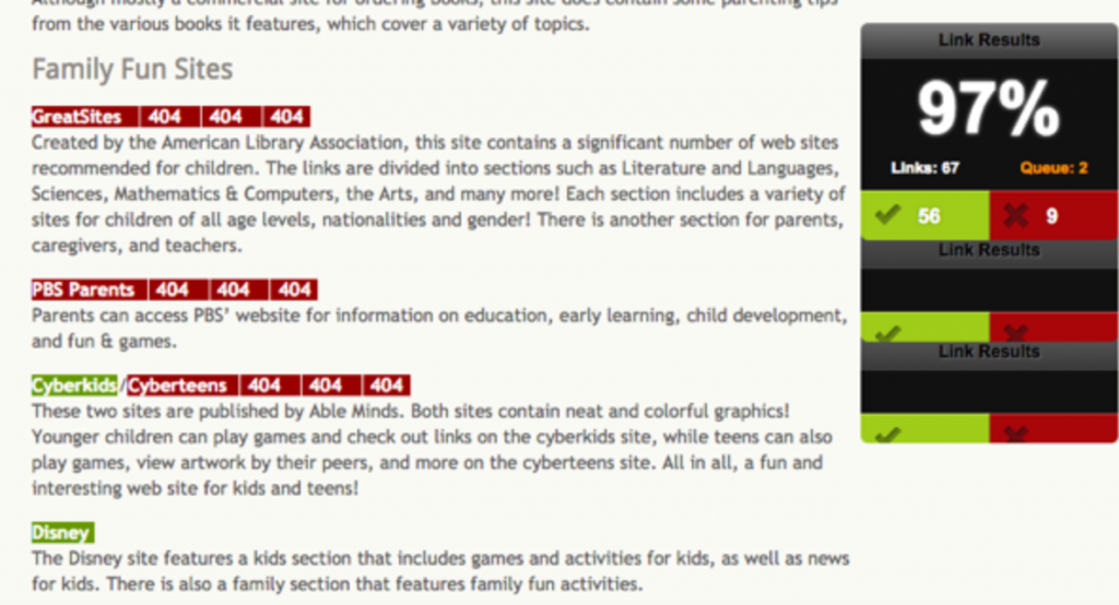 举例: 如果我有一个Parenting的网站,我会搜索 Parenting + links ,使用 Check My Links 这个插件,我会迅速找到所有来自网站的404的链接.
