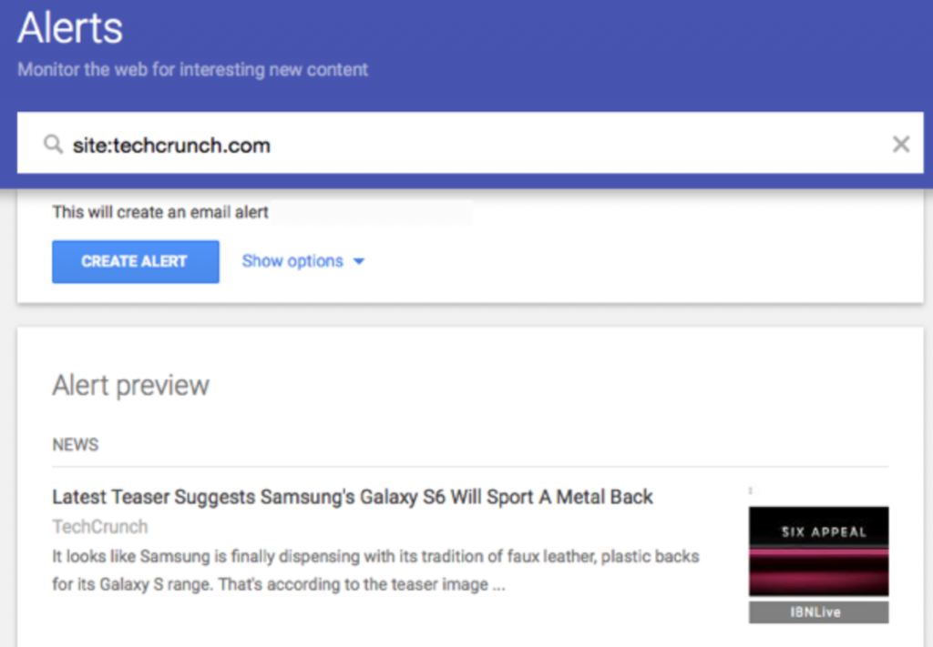 举例: 如果你的竞争对手是TechCrunch,在Alert上设置关键字 site:techcrunch.com