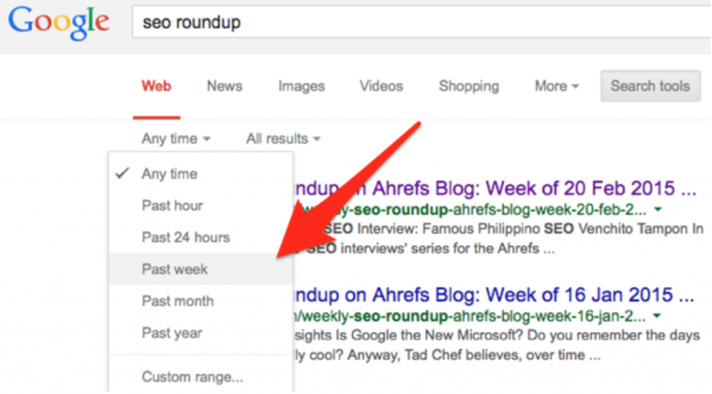 如果你不知道如何正确的宣传,即使是好的内容也不会让你获得外链。你应该通过邮件推广来宣传你最好的文章 其中一个最好的策略是一周或者一月一次联系博主发摘要。 方法: 1.使用谷歌指令keyword + roundup.,确保找到每周或每月的最新结果。