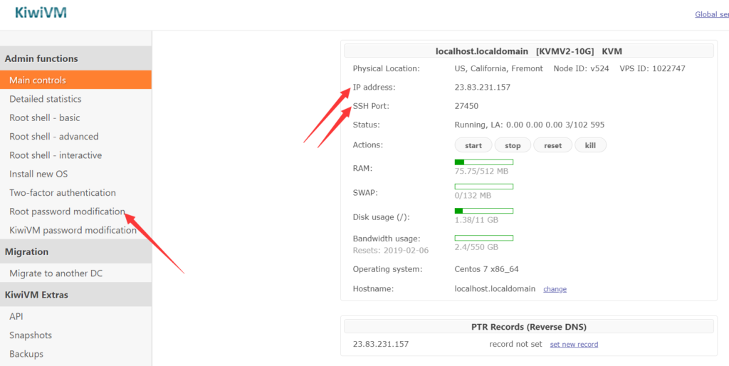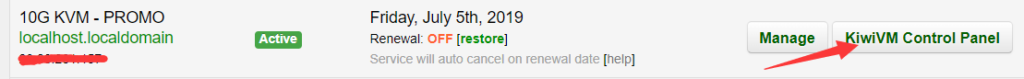 1. 点击对应VPS右侧的 Kiwi VM Control Panel 进入到控制面板 记录服务器IP,SSH Port 以及 Root Password 服务器密码