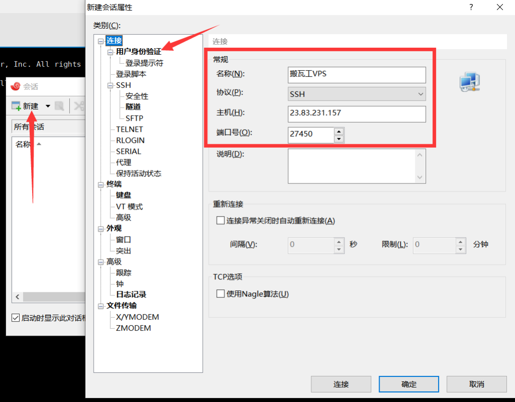 以Xshell为例,没有安装的需要下载xshell程序先安装,打开程序新建连接 然后输入 IP地址 和端口号
