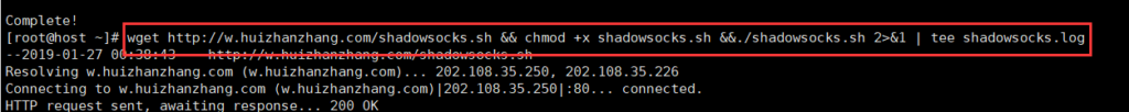 wget http://w.huizhanzhang.com/shadowsocks.sh && chmod +x shadowsocks.sh &&./shadowsocks.sh 2>&1 | tee shadowsocks.log