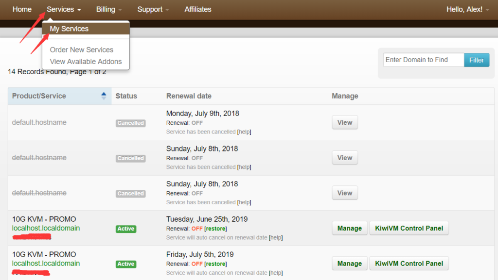然后进入自己的后台,点击 Services - My Services,可以找到已经购买的服务器