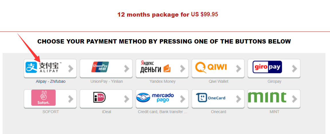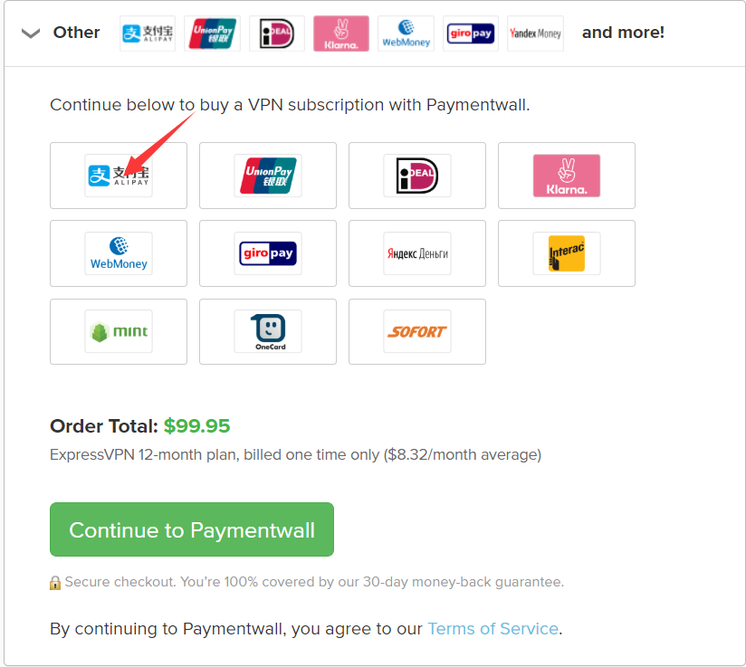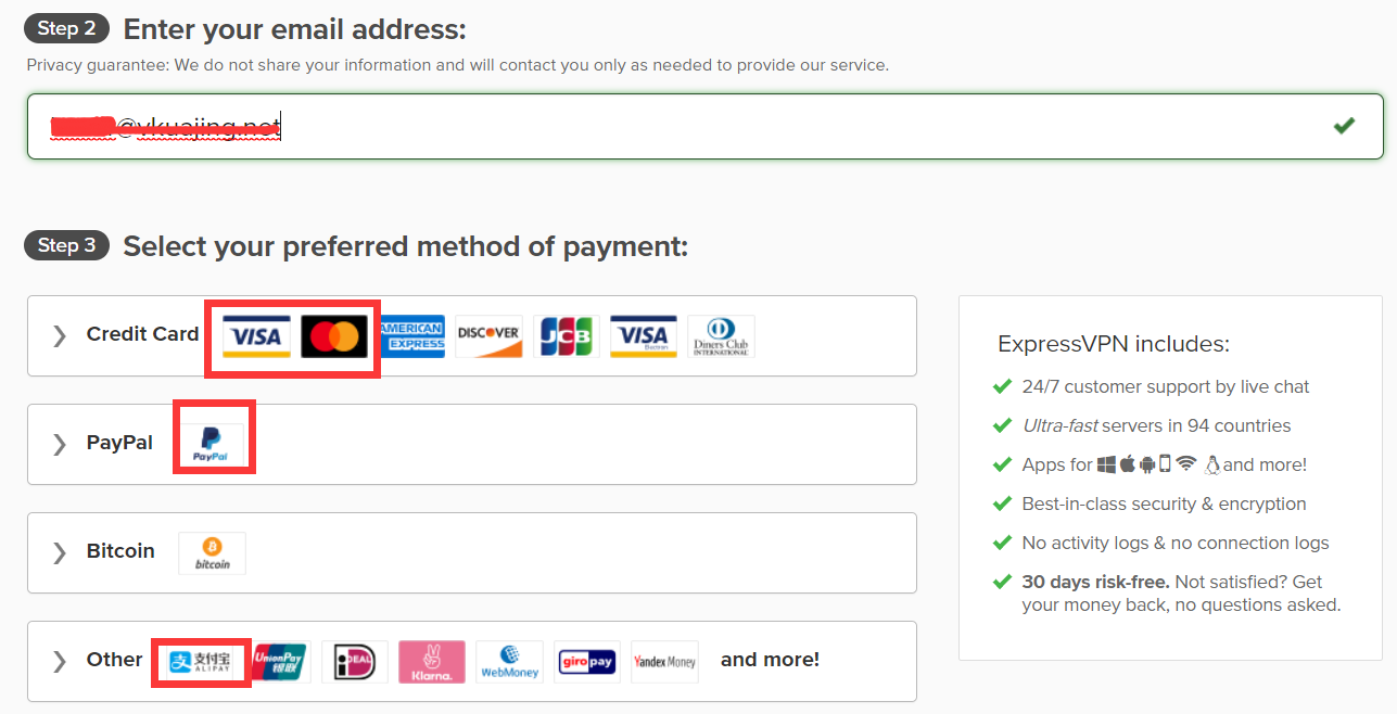 Express VPN的客户时全球各个国家都有,所以支持付款方式非常多,我们一般常用的也就是 支付宝 / Visa卡/万事达卡 / Paypal 支付