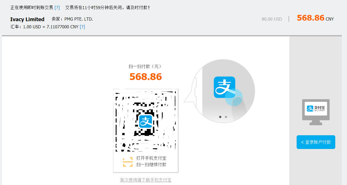 以支付宝为例,点击Pay with Alipay付款 ,输入Code 点 Apply
