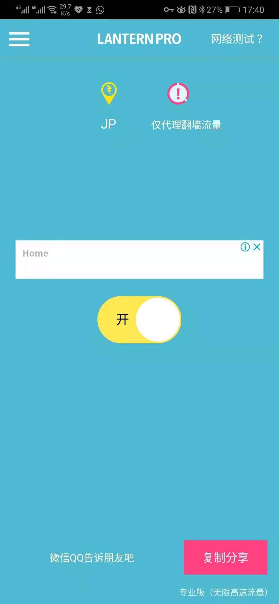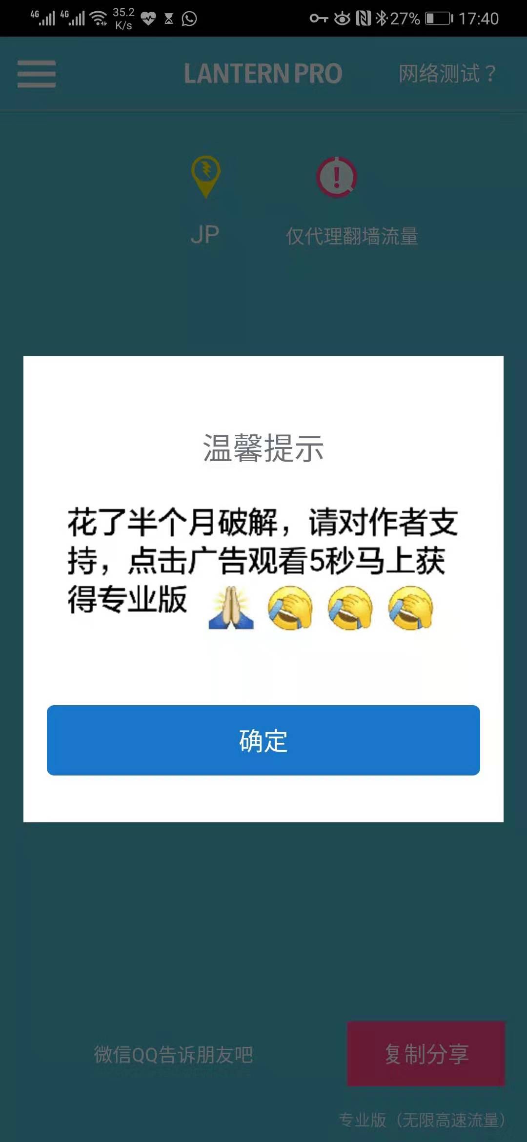 分享一个破解版的翻墙软件-蓝灯专业版 只有安卓版。