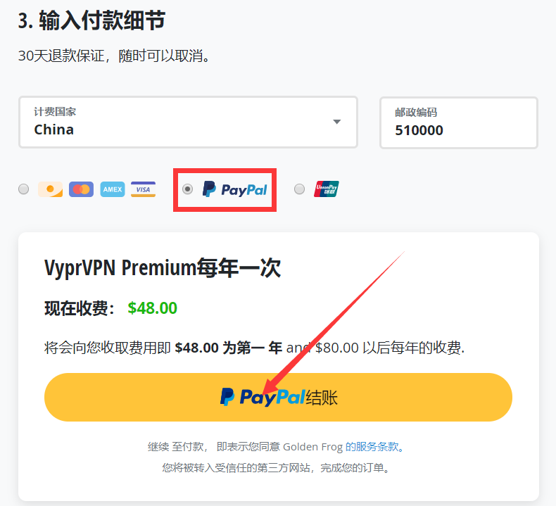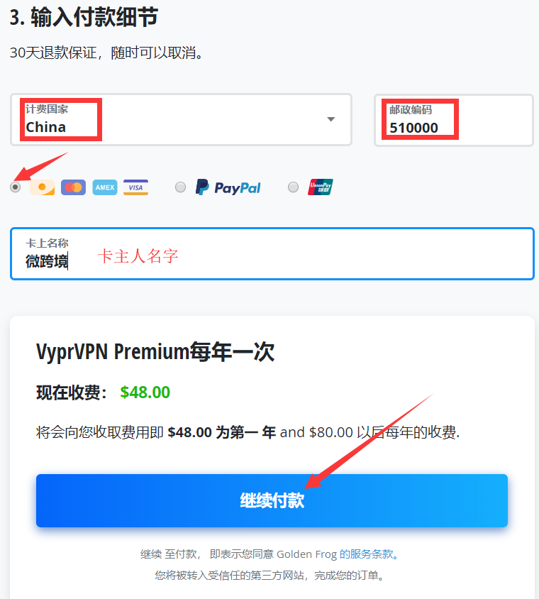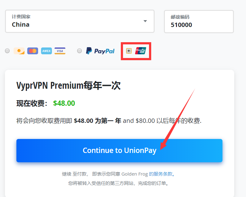 选中银联支付 ,点 Continue to Unionpay 付款 【1年48美金付款】