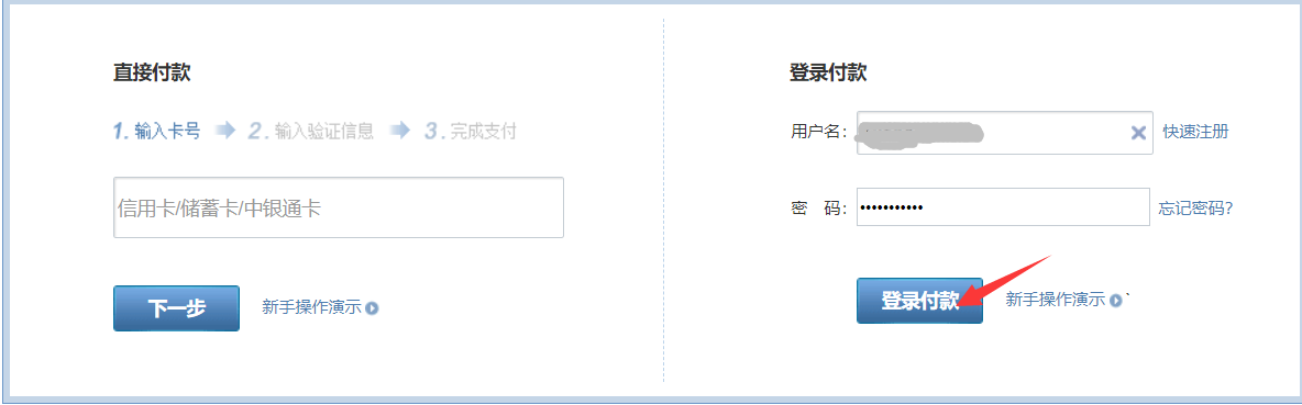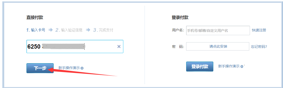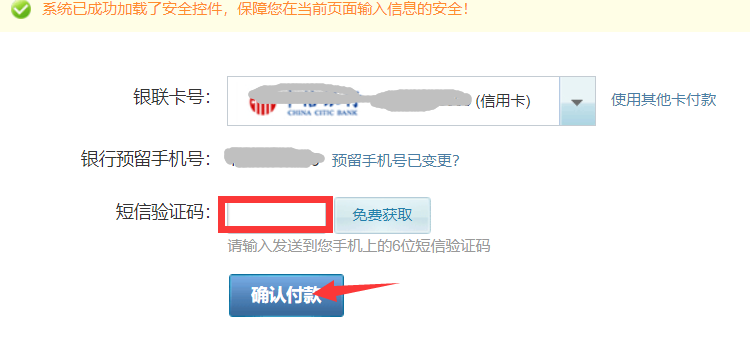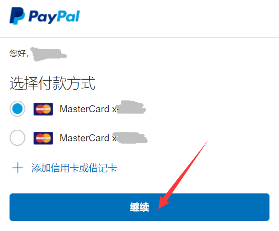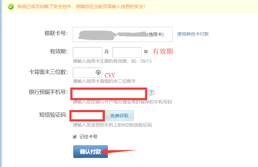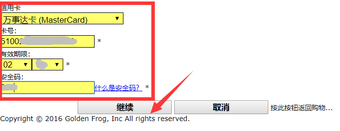 比如我选 万事达,填写 卡号 /有效期 /安全码 点击即可。