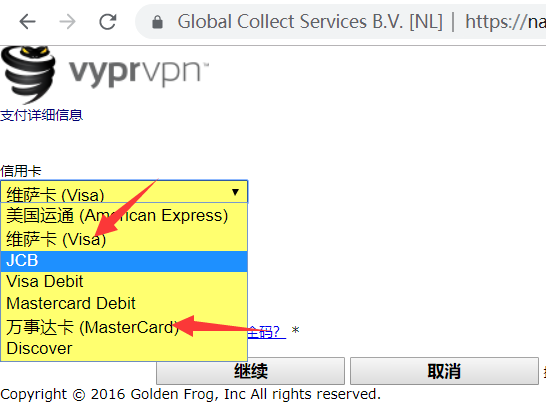 网页会自动跳转到荷兰的一个收单机构,这是因为信用卡的信息比较私密,有资质的收单行才可以做收款,第三方收到款会把转定期转给服务方【Vyrpvpn官方】,这样避免服务商直接接触到信用卡信息,保证安全性