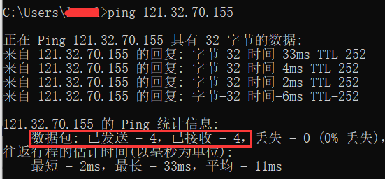 ping 121.32.70.155 这就是通的了; 发送4 接收4
