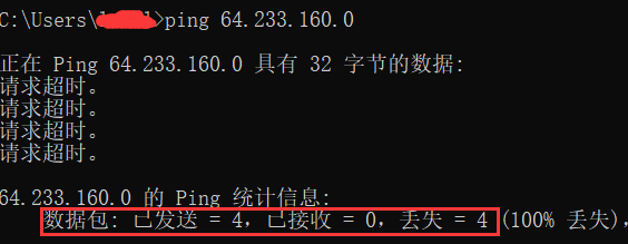 测试一下Google IP , ping 64.233.160.0 应该是不通的;发4丢4,这就是不通了。