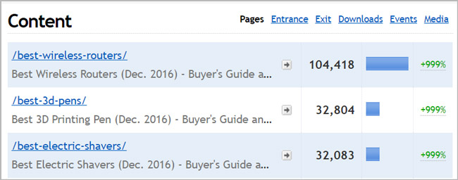 他的流量图主要集中在这三个页面best wireless routers, the best 3d pens and the best electric shavers to buy in 2016.