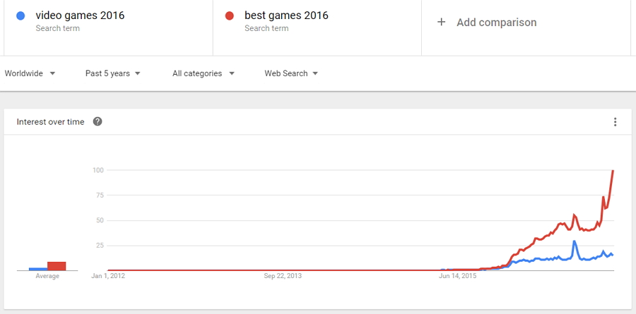 最后一个,我们看一个更普遍的利基市场 Video games 2016 和 best games 2016.